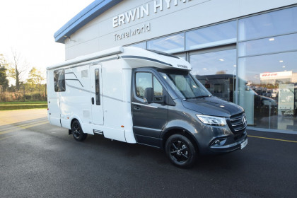The HYMER T-Class S 695 is a premium semi-integrated motorhome combining style and practicality, ideal for extended travels. At 7.39 metres long, it offers a spacious layout, sleeping up to four comfortably.