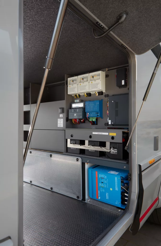 The motorhome has a50 Ah lithium battery as standard, but a Lithium Energy Pack is available as an additional upgrade, including two lithium batteries, a charging booster, a battery monitor and battery management panel, combi charger and more.